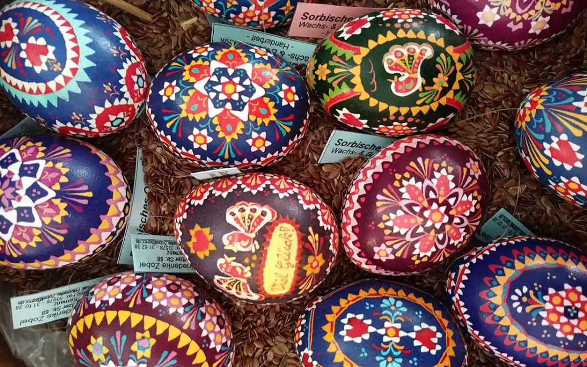 Die Kinder erfahren etwas über die Tradition der sorbischen Ostereier. Sie lernen die Symbolik kennen und lernen Wissenswertes über die verschiedenen Techniken wie Reservier-, Bossier-, Kratz- und Ätztechnik und probieren sich selbst im Gestalten bunter Ostereier.